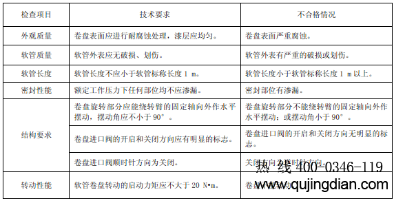 6.8.5.2.1 目測檢查消防軟管卷盤外觀質量、軟管質量和結構要求,用鋼卷尺測軟管長度,用直角尺測卷盤擺動角。